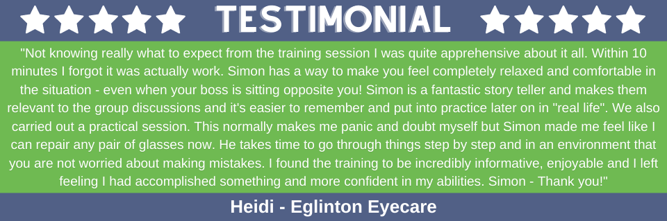 The fun interactive training session is spread over two days and is purposely designed to provide optical assistants in becoming more confident and knowledgeable in a patient-facing situation. The event takes the key areas from the first 3 courses. There will be NO role play involved, the event is about making you feel comfortable and relaxed whilst learning how to be CONFIDENT in your role. As well as a general understanding of the world of optics, you will be introduced to dispensing and frame fitting techniques as well as selling to lifestyle and communicating a memorable customer experience. Note that this is not hard selling, it's offering patients an informed choice about their eyewear options from both a visual and fashion style discussion.